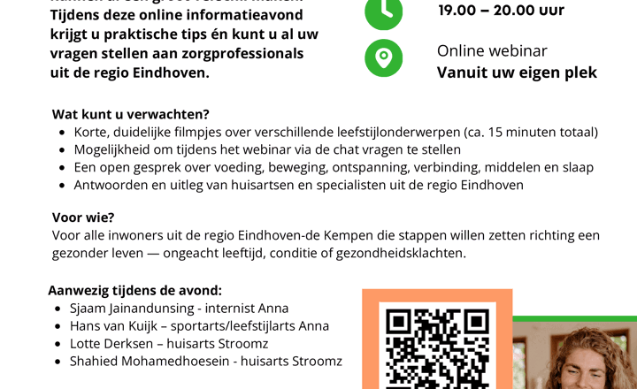 Wilt u zich fitter voelen, beter slapen of meer grip krijgen op uw gezondheid? Kleine veranderingen in leefstijl kunnen al een groot verschil maken. Tijdens deze online informatieavond krijgt u praktische tips én kunt u al uw vragen stellen aan zorgprofessionals uit de regio Eindhoven.