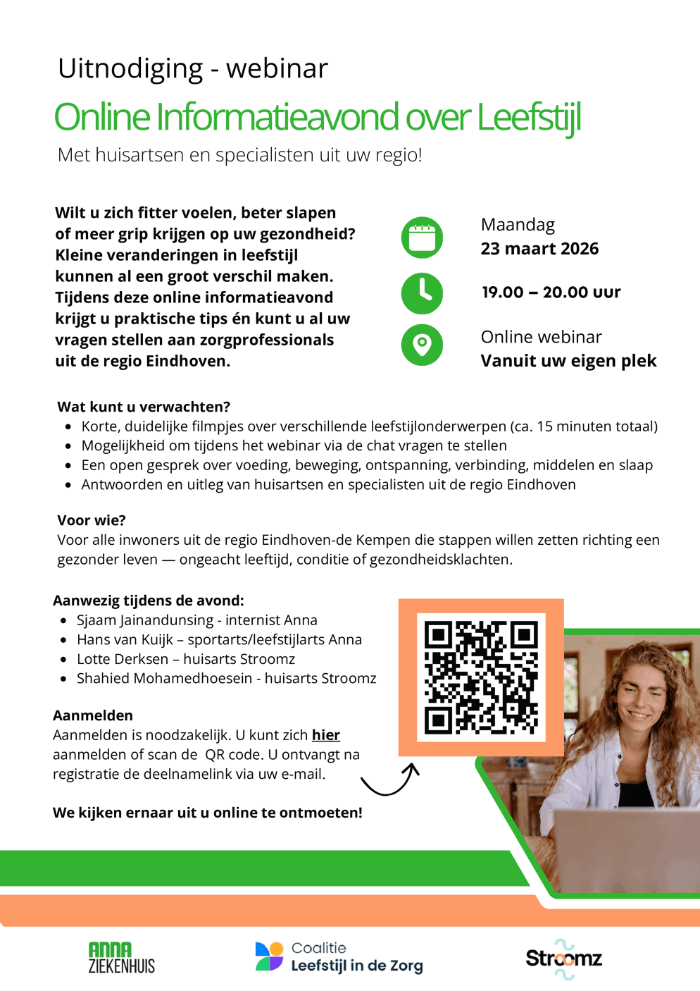 Wilt u zich fitter voelen, beter slapen of meer grip krijgen op uw gezondheid? Kleine veranderingen in leefstijl kunnen al een groot verschil maken. Tijdens deze online informatieavond krijgt u praktische tips én kunt u al uw vragen stellen aan zorgprofessionals uit de regio Eindhoven.